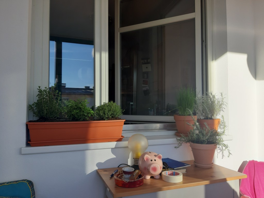 današnje poročilo dneva obsega trgovino in zelenje. Včeraj so se v Avstriji odprle mnoge trgovine, vse kar je manjše od 400 kvadratnih metrov. Šla sva v Obi, kjer sva kupla belo in črno barvo, stojalo za obešat cote, ki se prišraufa na steno, daktejp, lonce, zemljo, zaščitno olje za les, obešalnike. Do sedaj sva uspela narediti zeliščni vrt. Pomagal nama je lokalni vrtnar. Imava žnitloh, majaron, origano, timijan, rožmarin, baziliko, sivko in curry (indijska začimba). A veste, da obstaja zelišče Coca Cola!? Sploh se ne hecam, res je. Diši kot Coca Cola in iz nje lahko delaš sok. To nisva kupla.